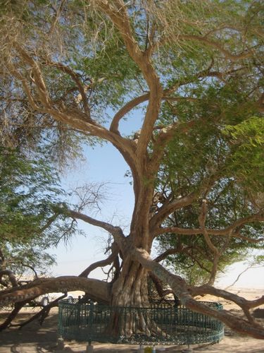 « C'est juste un arbre !» vous diront certains? Et bien non, ce n'est pas juste un arbre. Certes, ce très vieil acacia se mérite, perdu au milieu du désert au sud-est de Bahrein, à environ 2 km du Djebel Dukhan (la Montagne de la Fumée), le point culminant du royaume de Bahrein (137 mètres de haut quand même?). Mais après avoir visité le musée national de Bahrein, admiré les tombes vieilles de 5 000 ans de la civilisation Dilmund et déambulé dans le fort de Bahrein entourée d'un écrin de verdure, quand vous savez que Bahrein est considéré comme l'emplacement du mythique jardin d'Eden, alors vous verrez plus qu'un arbre. Une fois passé le circuit de Formule 1 puis le premier puits de pétrole du Moyen Orient, on admire l'arbre de vie, perdu tout seul au milieu du désert ! On se demande ce qu'il fait la et pourquoi il est la. La légende veut qu'il soit l'unique vestige du mythique jardin d'Eden ! Sa source d'approvisionnement en eau demeure un mystère. La foule se presse pour admirer cet acacia, profiter de l'ombre salutaire qu'il procure pour pique-niquer, toucher ses feuilles et faire un v?u. Malheureusement, certains écrivent des graffitis sur son tronc et d'autres arrachent ses branches qu'ils emportent comme un porte-bonheur, bref, l'arbre de vie est victime de son succès.
